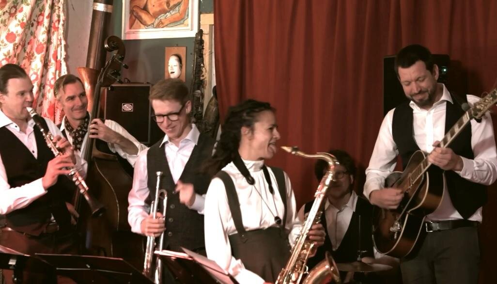 Das «Pavilion Dance Orchestra» aus Zürich liebt es einfach, für Swing-Tänzer:innen zu spielen! Das beweisen sie immer wieder an den zahlreichen und regelmässigen Konzerten, die sie u. a. für die Swingscouts spielen. Sie musizieren mit absoluter Leidenschaft und entführen ihre Zuhörer:innen in die entscheidenden Momente der Swing-Ära, indem sie in die elektrisierende Musik von Benny Goodman, Charlie Christian und Billie Holiday eintauchen. Sie sind nicht nur ein Ohrenschmaus - sondern es macht auch Spass sich visuell von der Live-Swing-Musik mitreissen und verzaubern zu lassen.
